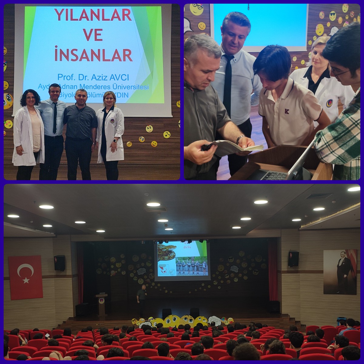 Okulumuz Bioted bilim grubunun “Doğa Koruma” projesi kapsamında davet edilen, ADÜ Biyoloji bölümü, zooloji ana bilim dalı öğretim üyesi okulumuz lise kademesi öğrencilerine “Yılanlar ve İnsanlar” adında bir sunum gerçekleştirdi. Öğrencilerimizin yoğun ilgisiyle gerçekleşen sunum sonunda, Prof. Dr. Aziz AVCI öğrencilerimizin sorularını yanıtladı. Prof. Dr. Aziz AVCI’ya bu faydalı sunumlarından dolayı çok teşekkür ediyoruz.